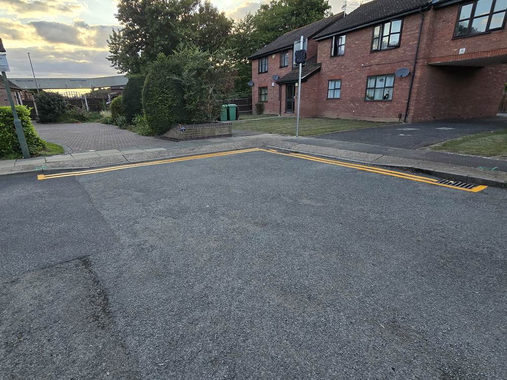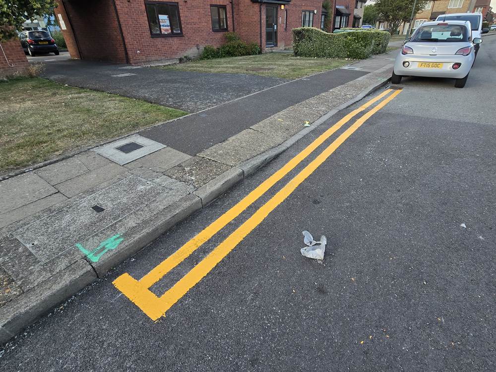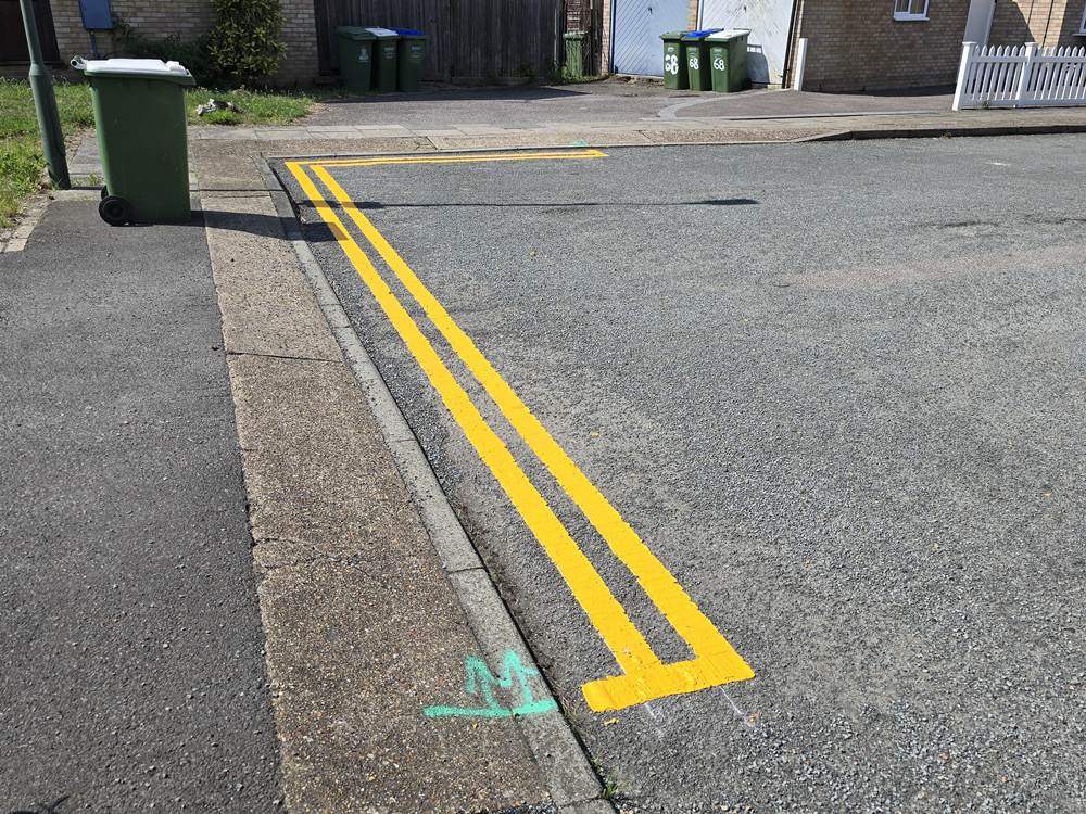 Two unfinished lines (due no current parking restrictions) and one completed. Commuters in private parking bay.