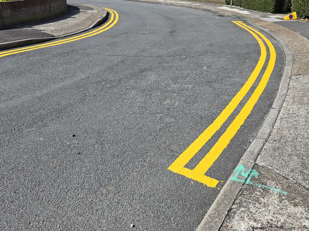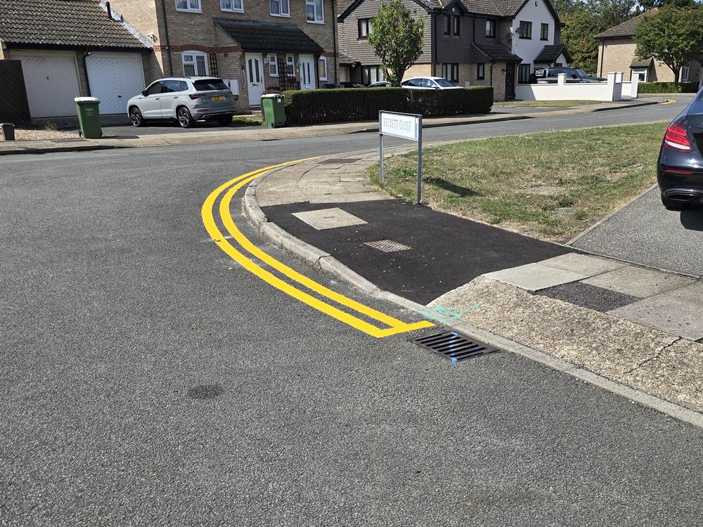 Footpath lined. Redundant dropped kerb not lined, (a garage was converted to living space). New lines on bend. No sign on exit.