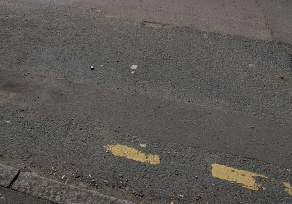 Not far away is a parking bay with an adjacent yellow line. It is in such bad condition