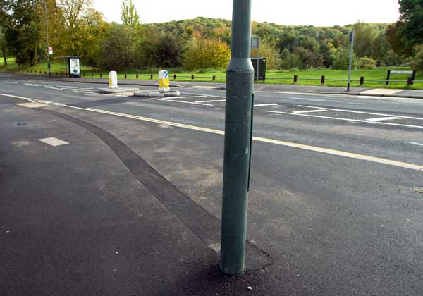 then new patch in the road below which lies a conduit, installed the previous day, to the unlit bollard.