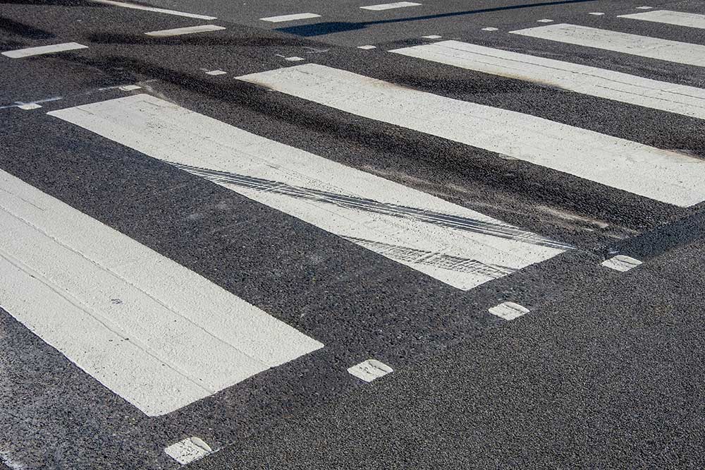 are skid marks on the newly painted crossing and a keep left sign is looking