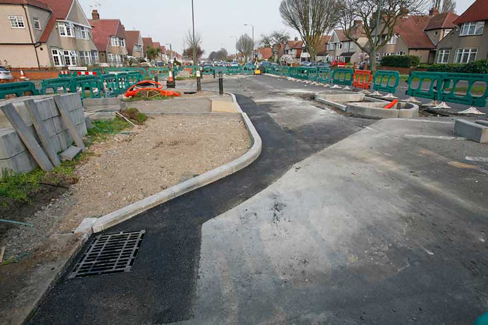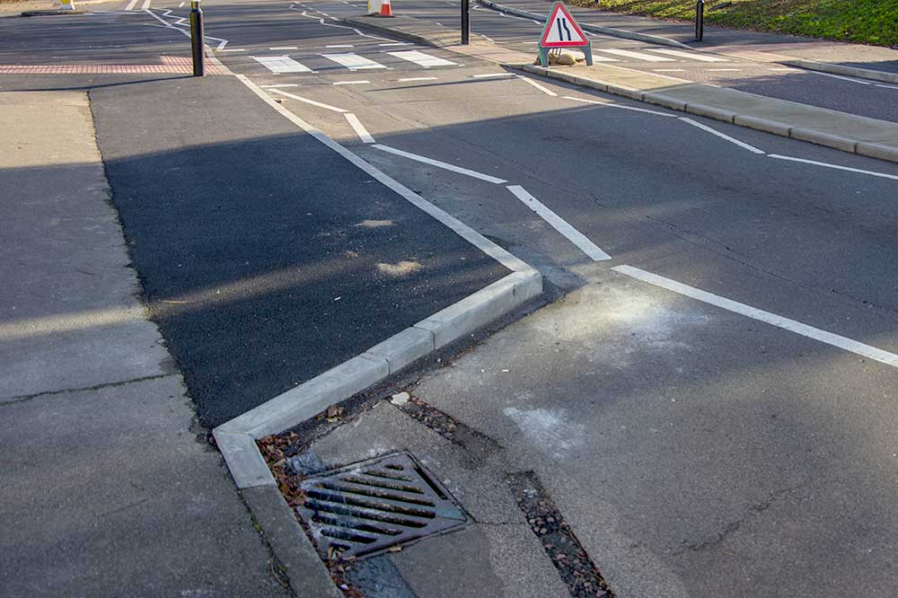 re-sited pole and the tactile paving. The black patch is where the pedestrian refuge used to be.