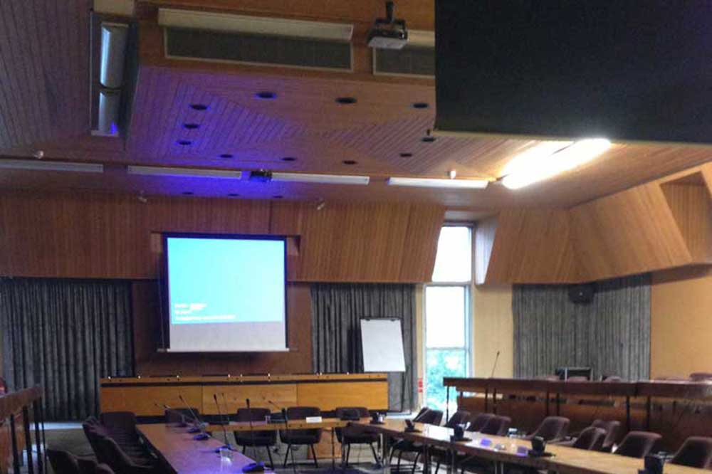 of screens with projectors had been set up so that members of the public could see what