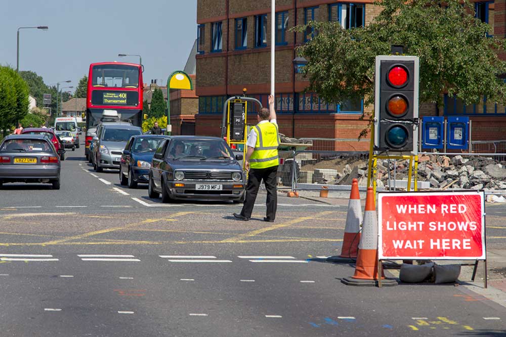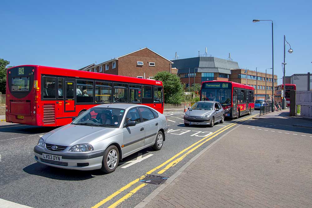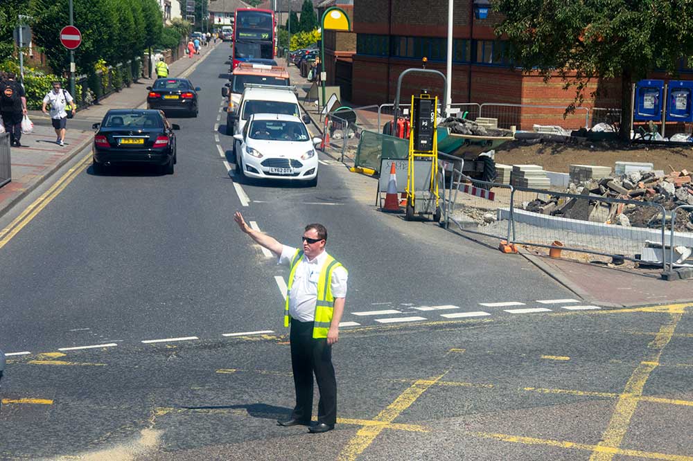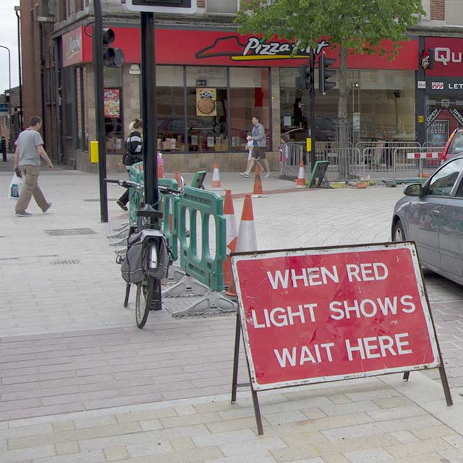 Broadway, formal crossing points. Presumably increased footway width can only