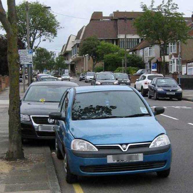 In London parking on the pavement, even a tyre on the kerb by an inch, is not