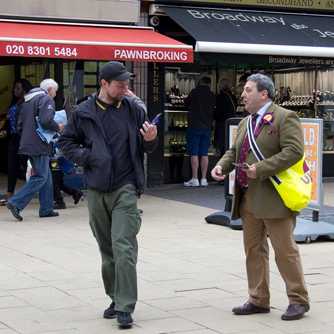 wearing yellow and purple rosettes. UKIP was in town. I stopped to have a word