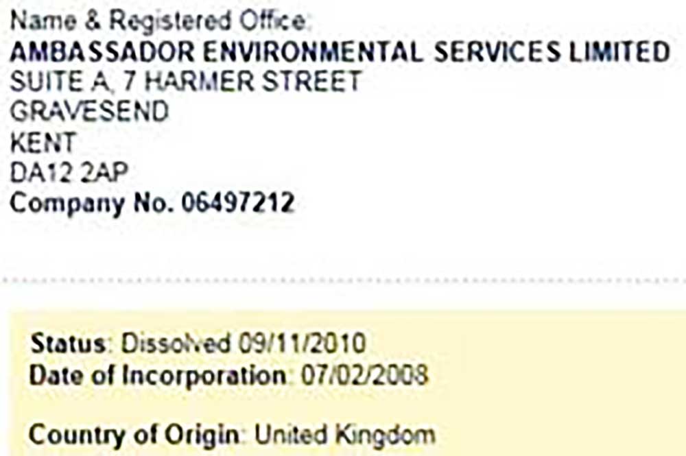 Ambassador Environmental Services went bust three years ago.
