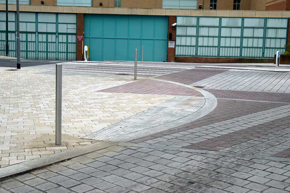 The large expanse of kerbless paving outside the police station (Photo 5) is now guarded