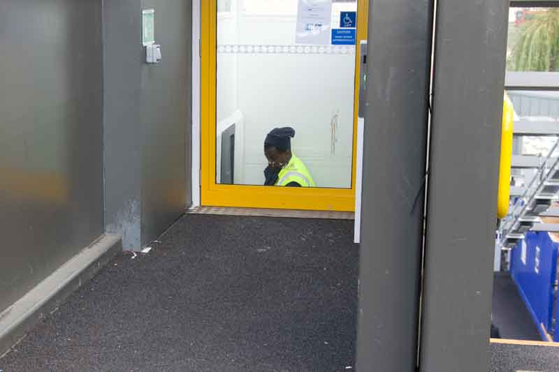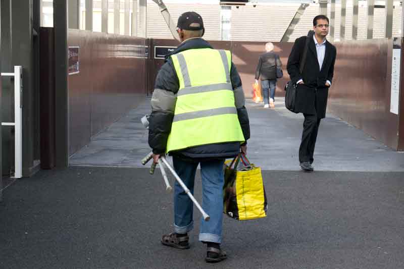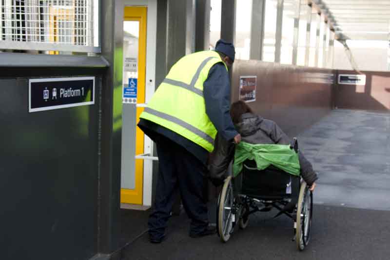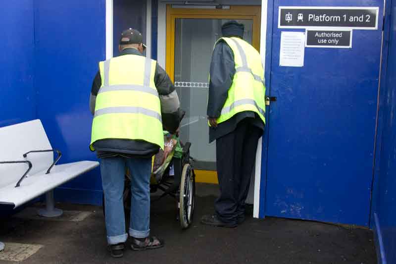 I approached the station this afternoon a man in a yellow jacket was pushing a lady in a