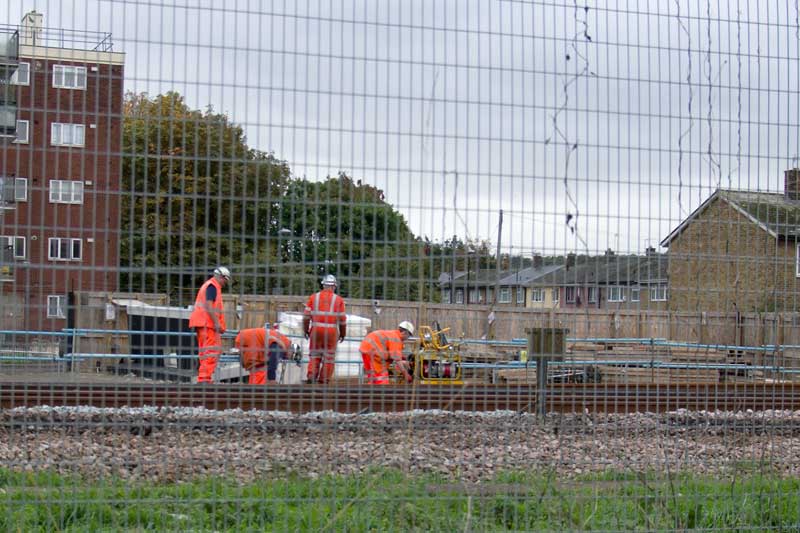 The security guard told me that the new footbridge will be open tomorrow morning. By the time I had retraced my steps to Eynsford Drive the transport of lengths of rail had stopped and there was the strong smell of grinding wheels coming from the men seen in the final photograph above.