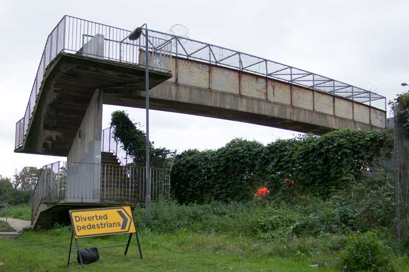 footbridge which was adorned with a ‘Diverted pedestrians’ sign. Who in their