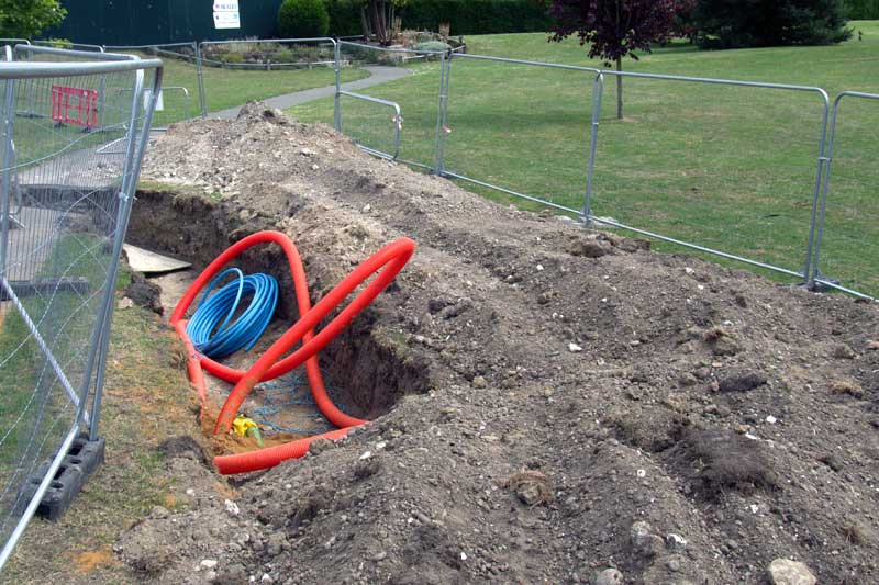 The hole in the ground is totally unexplained. Perhaps a conduit for one of the utility services to use.