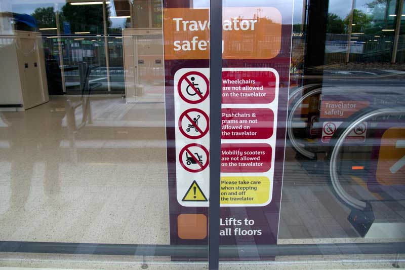 The beautifully positioned but still prominent travelator warning is welcoming is it not but the
