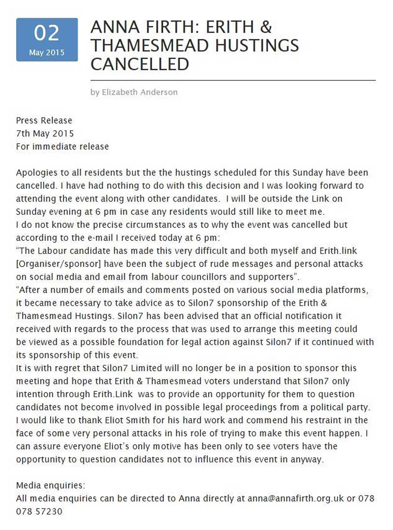 sponsor of the ill-fated Erith & Thamesmead hustings and