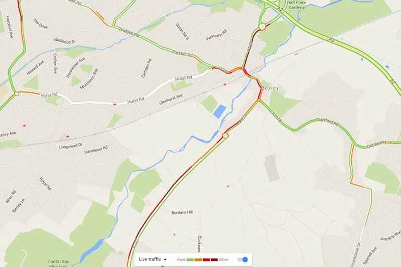The map shows the extent of the traffic queue at that time. Pity the poor rush hour commuters.