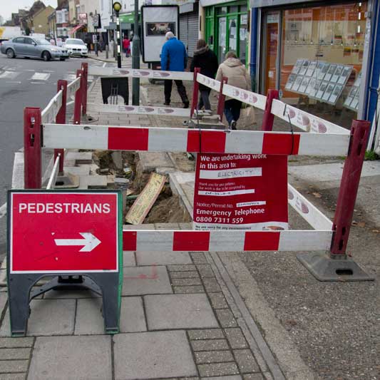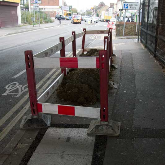 Two months ago the Knee Hill Abbey Road junction in Abbey Wood was disrupted for two weeks by totally unnecessary three way traffic lights. The reason was that a barrow load of earth had been dumped in the road and it had to be protected. The work itself was wholly on the pavement.