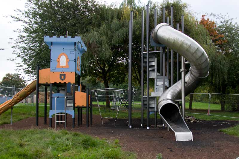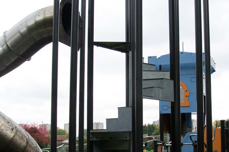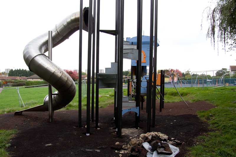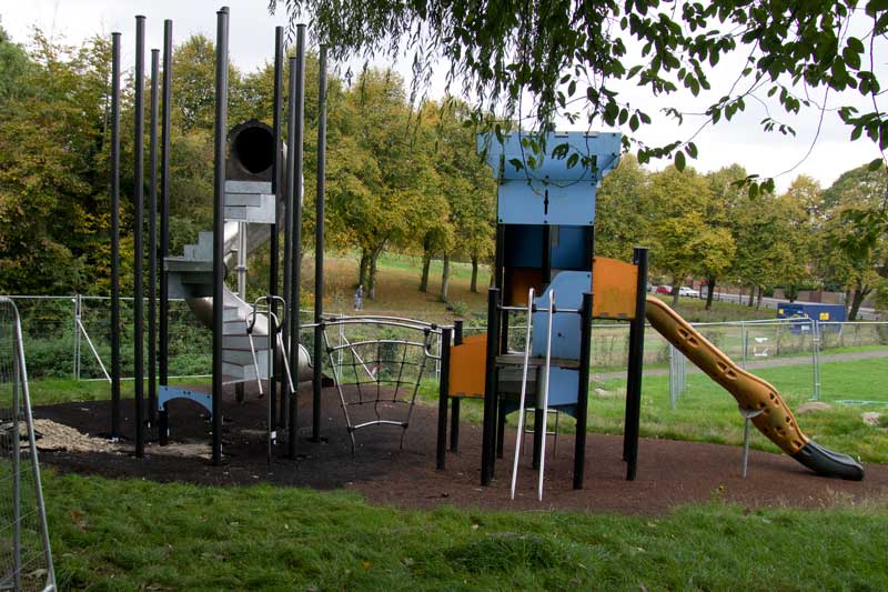 The contractors who were in Lesnes Abbey Park early on Friday morning with a lorry load of new slide have not been hanging about. Yesterday the main vertical support members were installed.