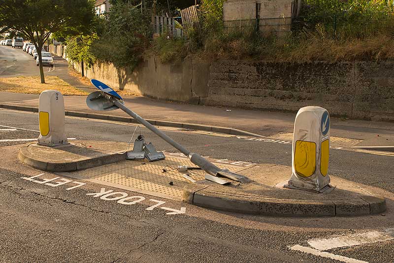 It’s very hard to work out how someone could take out a road sign while avoiding the plastic Keep Lefts either side of it.