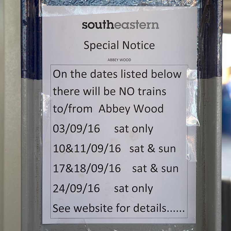 but not on Sunday. The Southeastern notice at the same station (Photo 2) says there will be no service