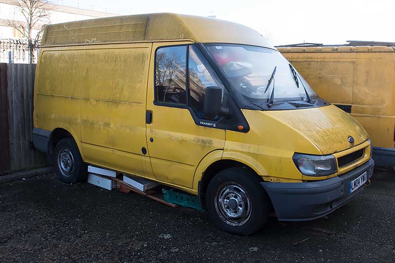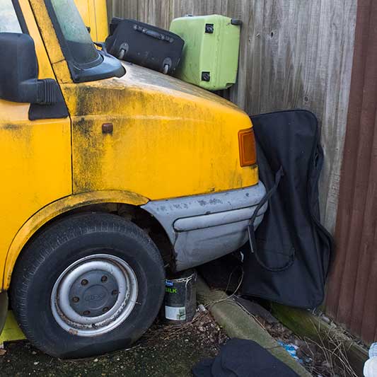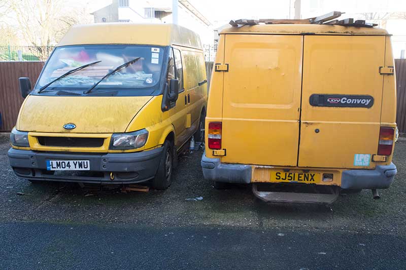 The vans are on private land and used as a storage facility for the owner’s building company. Look closely and you can see the vans are crammed full of wood and junk.
