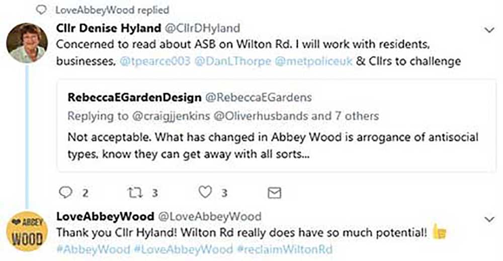 to Twitter comment today she expressed concern with the Anti-Social Behaviour. If