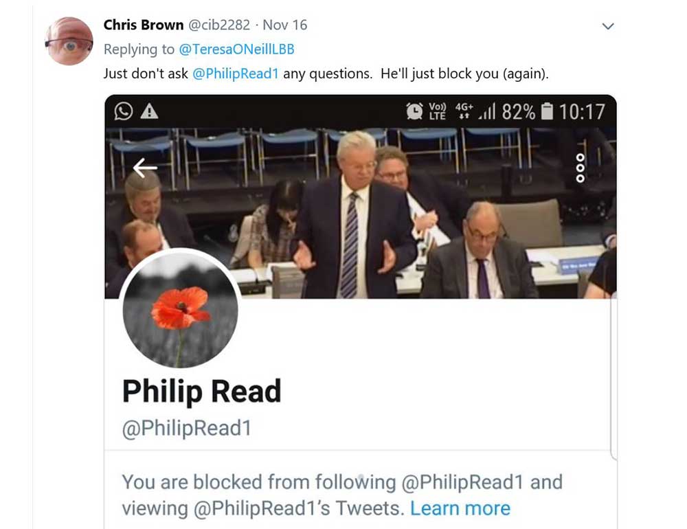 his former ward’s shopping centre, Read reacted as all cowards with closed minds do. He blocked the resident from reading his Tweets.