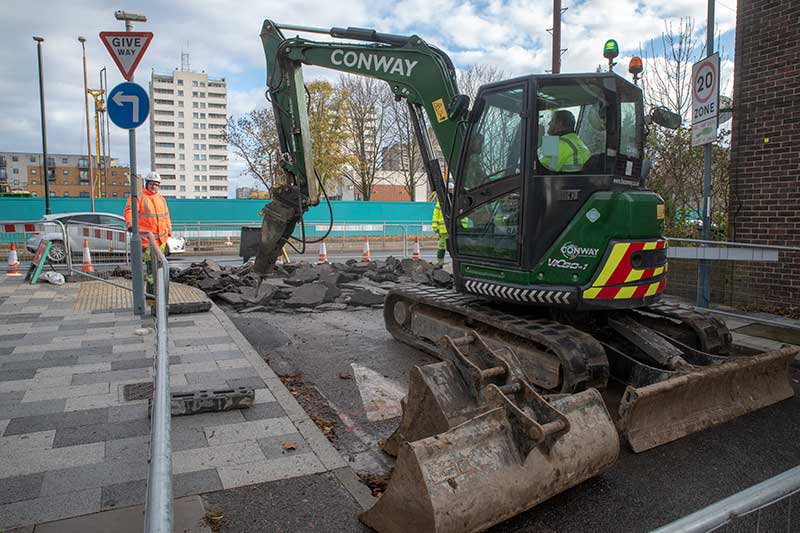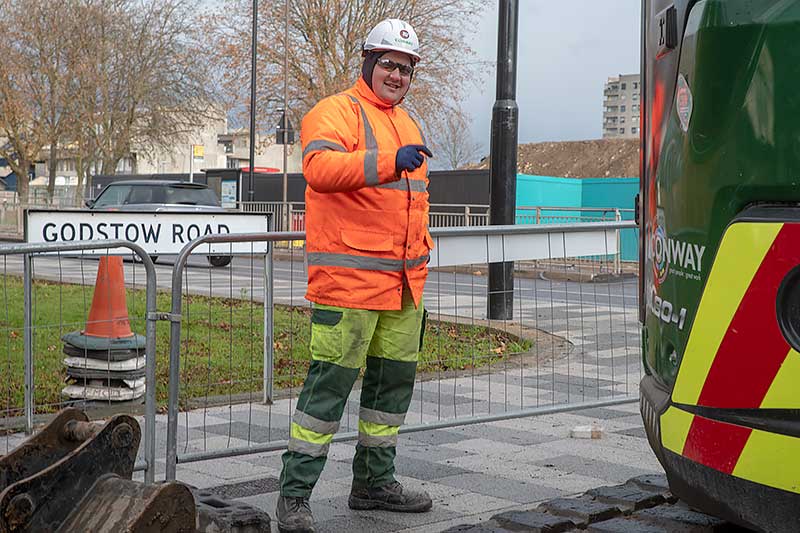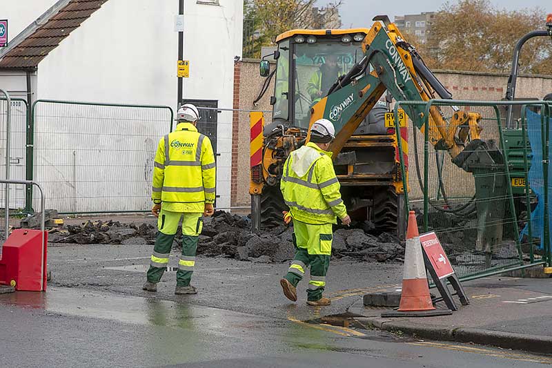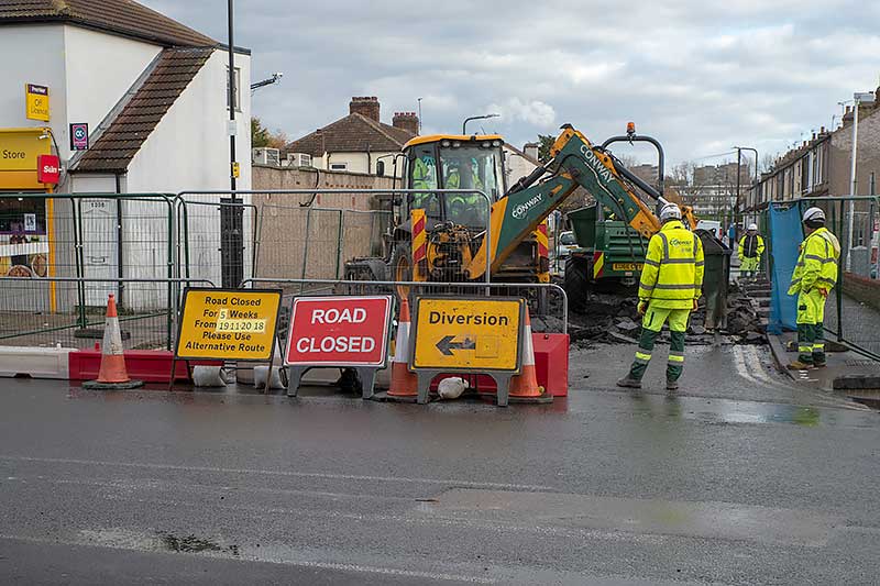 Opposite Overton Road the access to Sainsbury’s is being rebuilt half a road width at