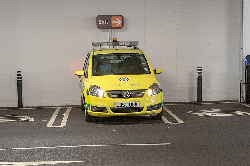 With supreme irony an NHS response vehicle is parked among the electric car chargers with its engine