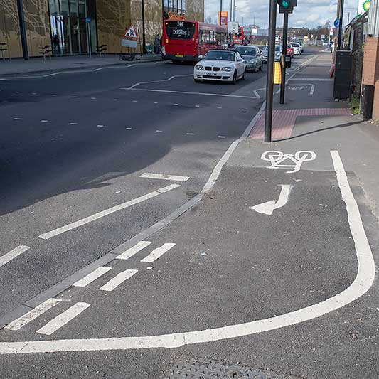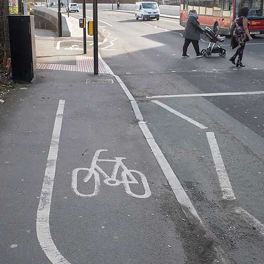 Cyclists are directed up on to the pavement away from the crossing where they can scatter any waiting