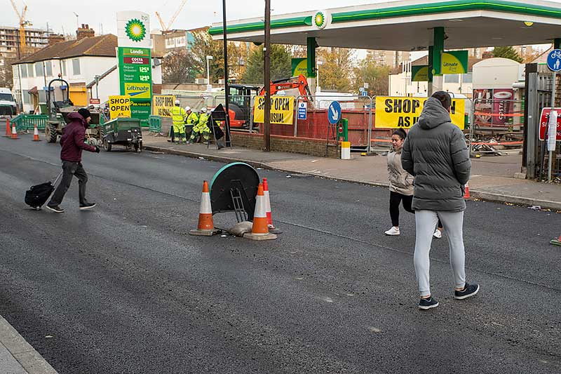 Bexley Council now aims to wrap up the work on Harrow Manorway by the end of the year which will make completion a mere 18 months late. However it cannot be denied that is at last taking shape quite quickly now. The last section to require resurfacing was done overnight this week and when I drove into Sainsbury’s at 07:15 this morning (used car because it was raining hard!) a man in a van was tinkering with the non-functioning pedestrian crossing lights and when I drove out ten minutes later they were shining brightly. No longer will we have to wait several minutes for a gap in the traffic as I did the day before yesterday. (Photo 1.).