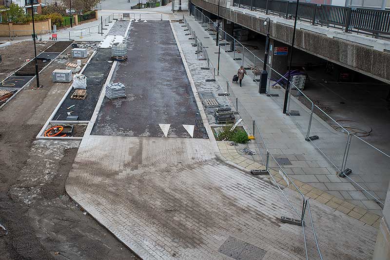 The Z bend road is at the same height as the footpath and it leads straight towards the station lifts.