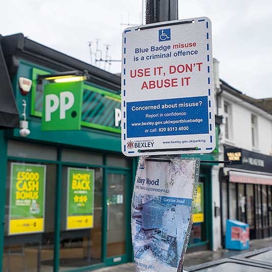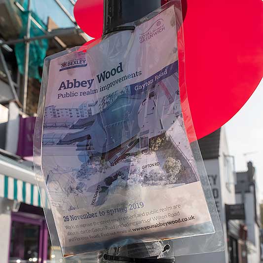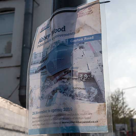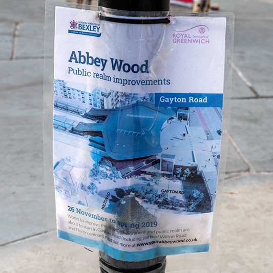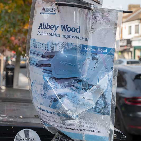 posts near to the railway station are adorned with dilapidated Bexley Council notices.