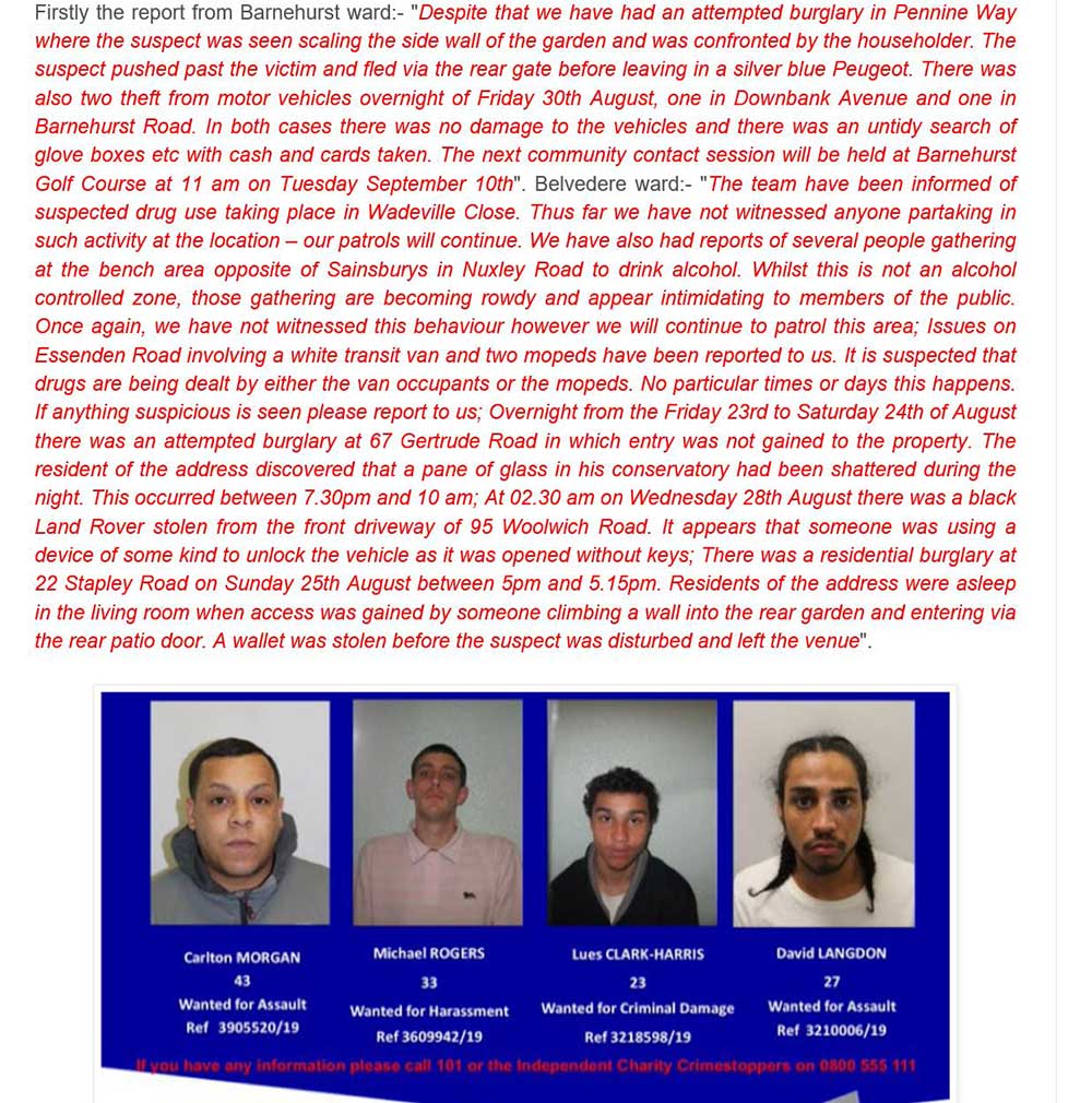 If the snapshot of Hugh’s blog is not big enough to read on your tiny screen, it says that “a black Land Rover was stolen from the front drive of 95 Woolwich Road, Belvedere”.