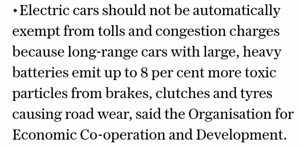Electric cars create eight percent more toxic particles from brakes, clutches and tyres.