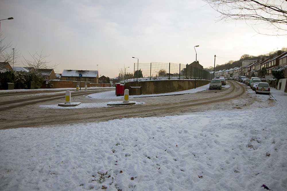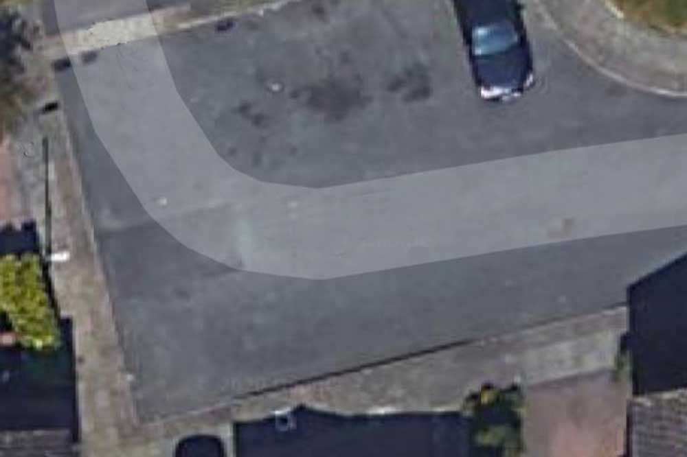 going around the bottom left corner all at the end of an area designated as a turning circle on the original 1986 plans.