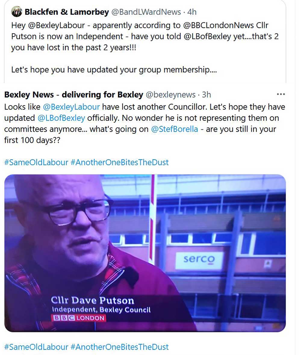 While I was at the Oval this evening, Bexley Tories were making mischief with the news that Councillor Dave Putson