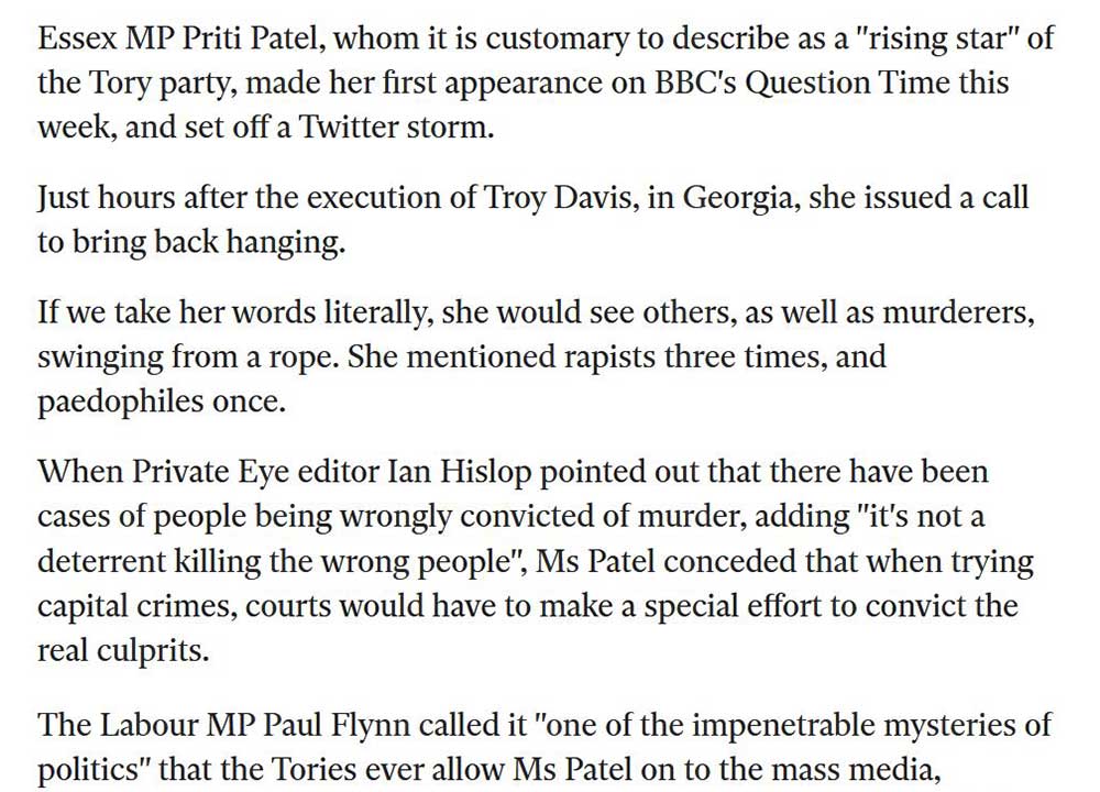 She now denies it but I heard her say she wanted to bring back the death penalty. It wasn’t for the first time. (Mail on Sunday 2006.)