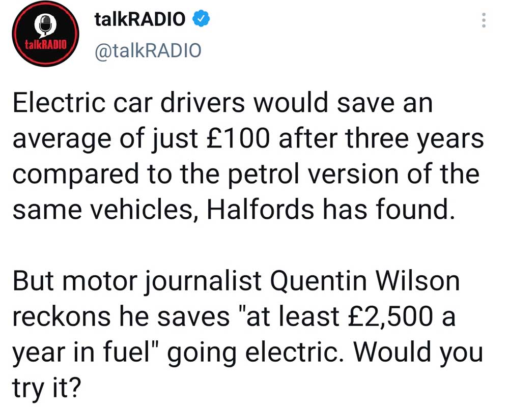 petrol heads were ecstatic when the TalkRadio man came out against electric cars and went down the usual path that their diesel SUVs