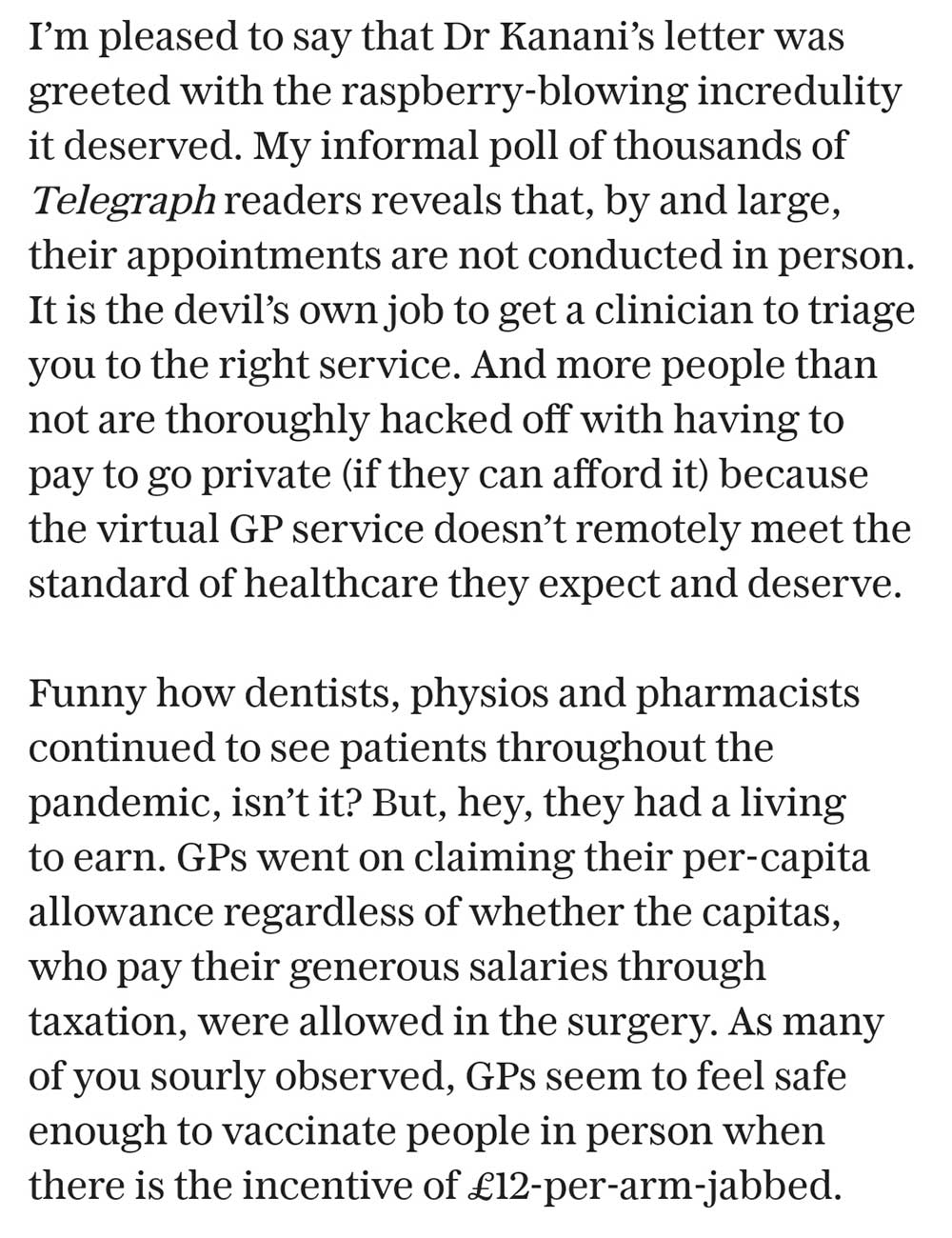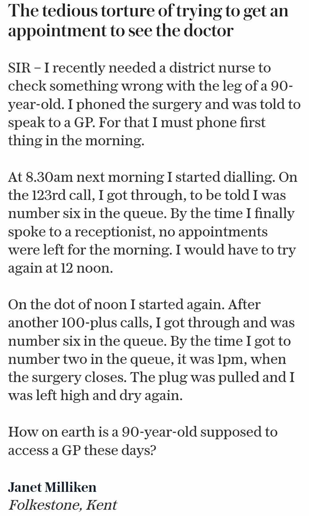 Janet Milliken from Folkestone pretty much sums up the unnecessary difficulty one encounters when trying to get hold of a GP although to be