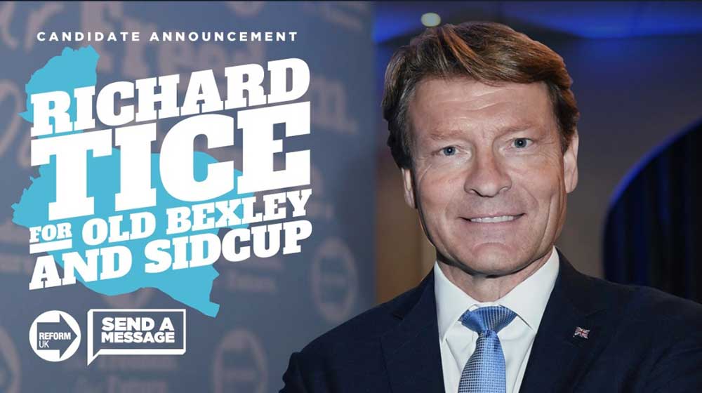 Last night The Reform Party leader Richard Tice threw his hat into the Old Bexley & Sidcup ring to challenge