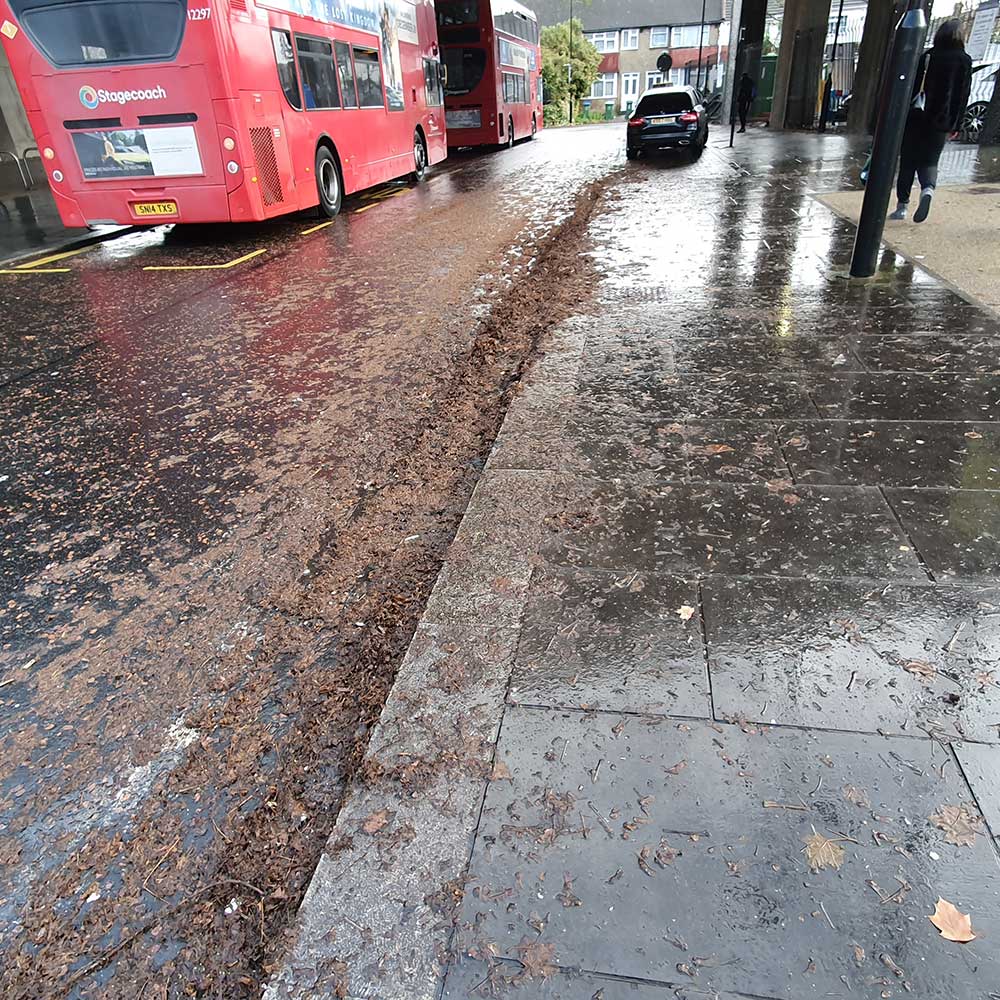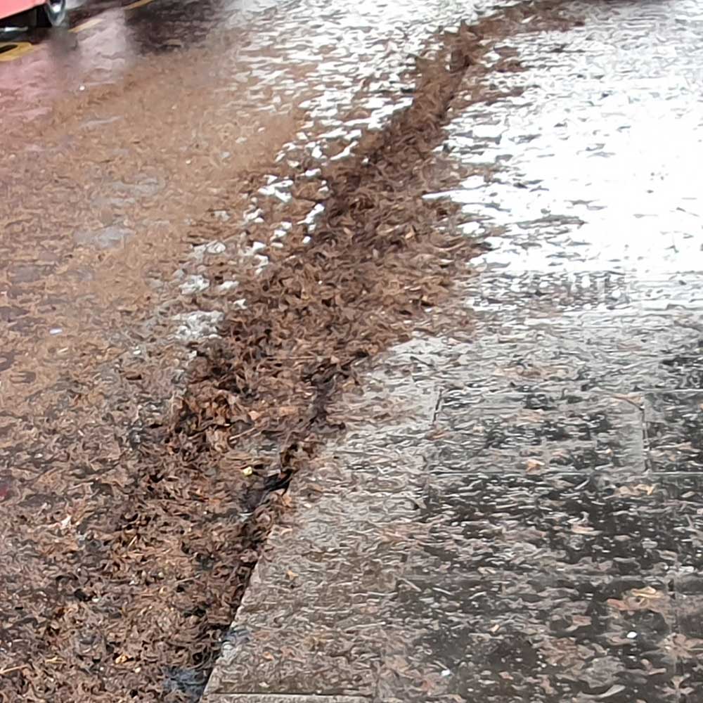 footpath was entirely covered by slippery fallen leaves. The drain gullies were completely blocked by them.