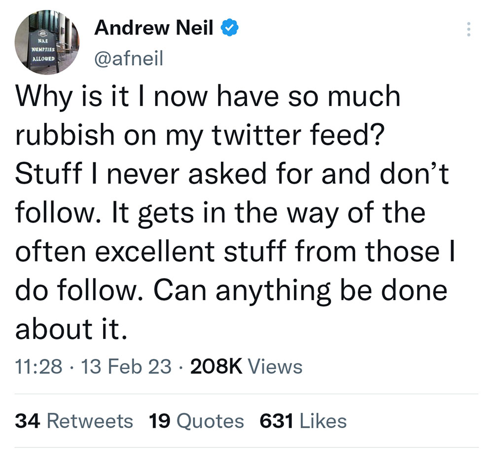 Journalist Andrew Neil is evidently suffering much the same; we are being shown Tweets we
