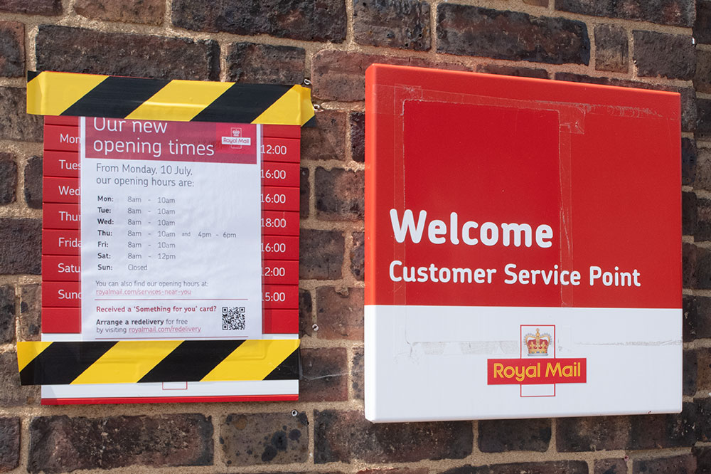 sorting office opening times from 45 hours (first image) a week to 16 (second image.)