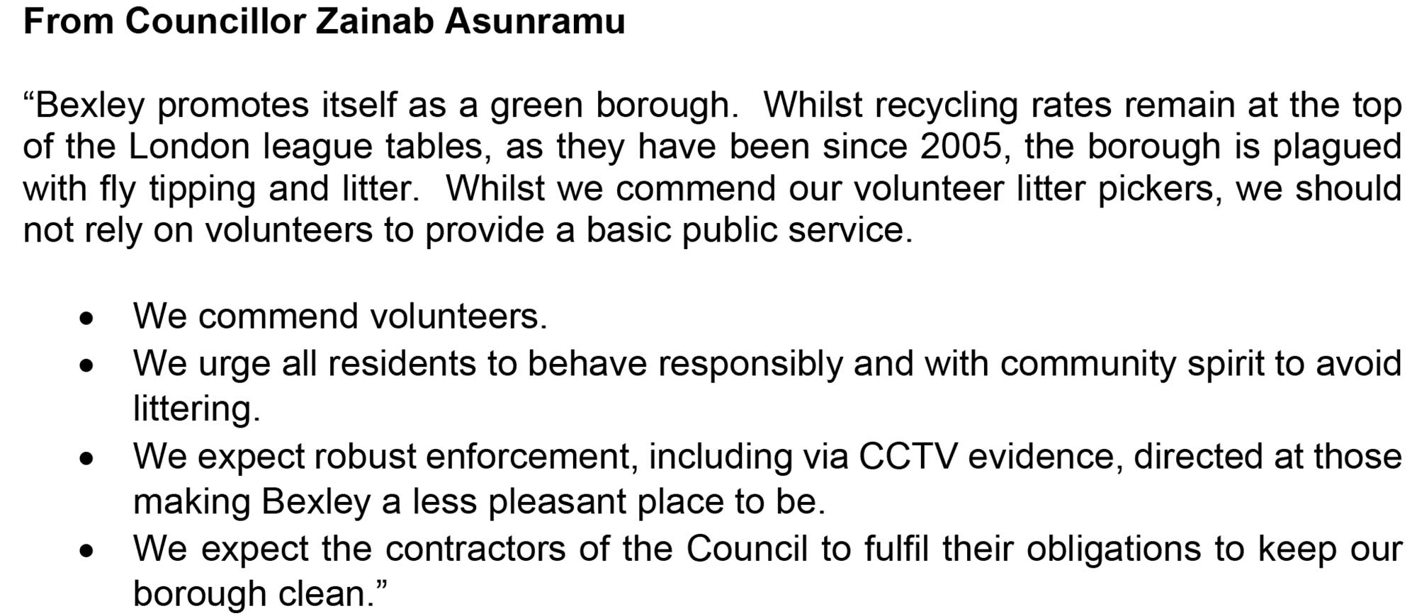 contribution to keeping Bexley cleaner and greener, condemned the fly tippers, welcomed the