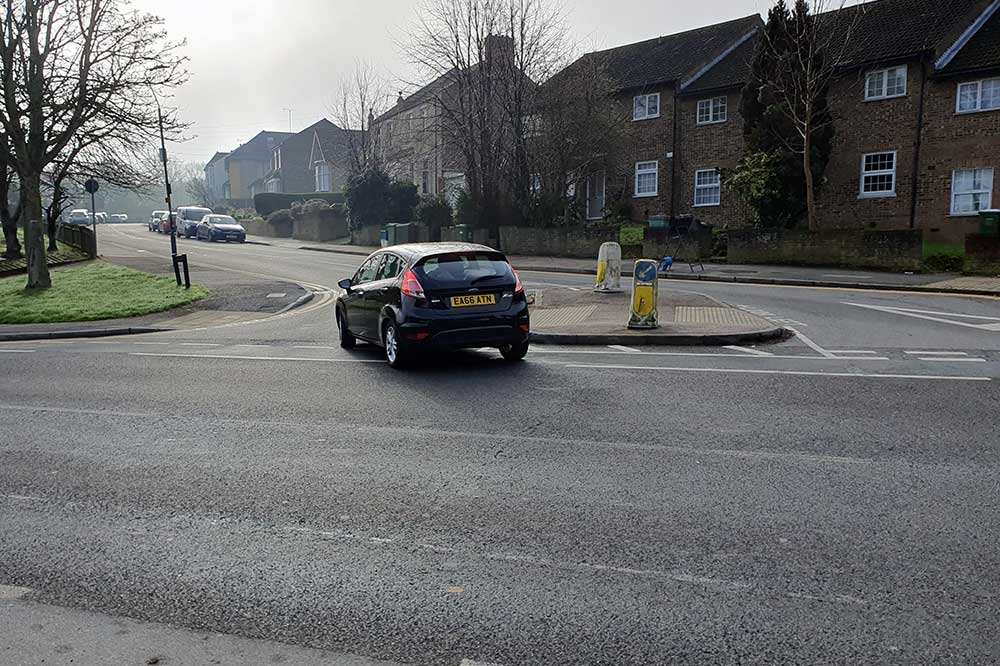 lawlessness (parking on junctions contravenes the Highway Code) forces traffic exiting Carrill Way to be on the wrong side of the