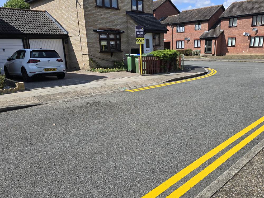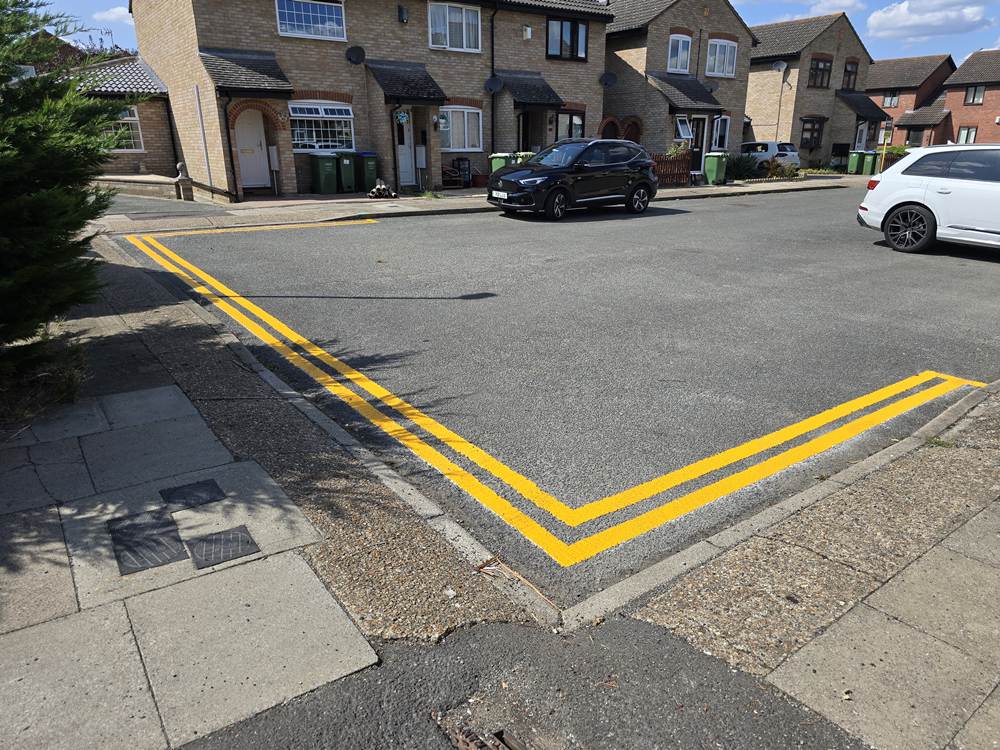 Two unfinished lines (due no current parking restrictions) and one completed. Commuters in private parking bay.