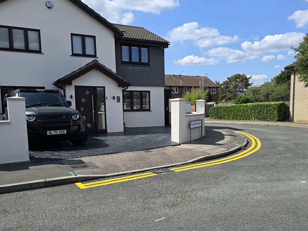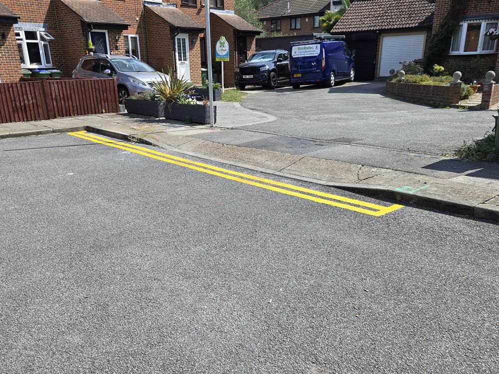 Footpath lined. Redundant dropped kerb not lined, (a garage was converted to living space). New lines on bend. No sign on exit.
