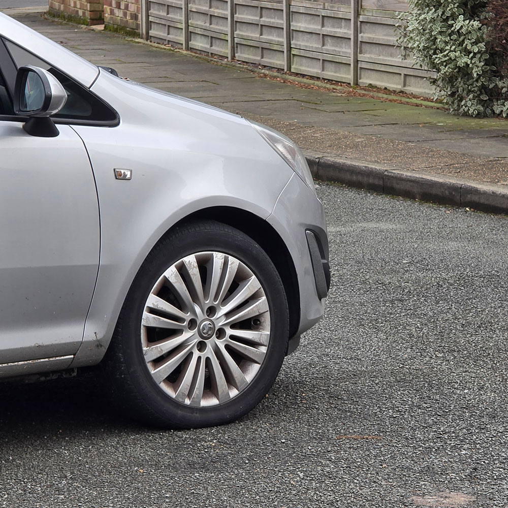 wheel does not block the dropped kerb by much but the rear wheel is angled a long way