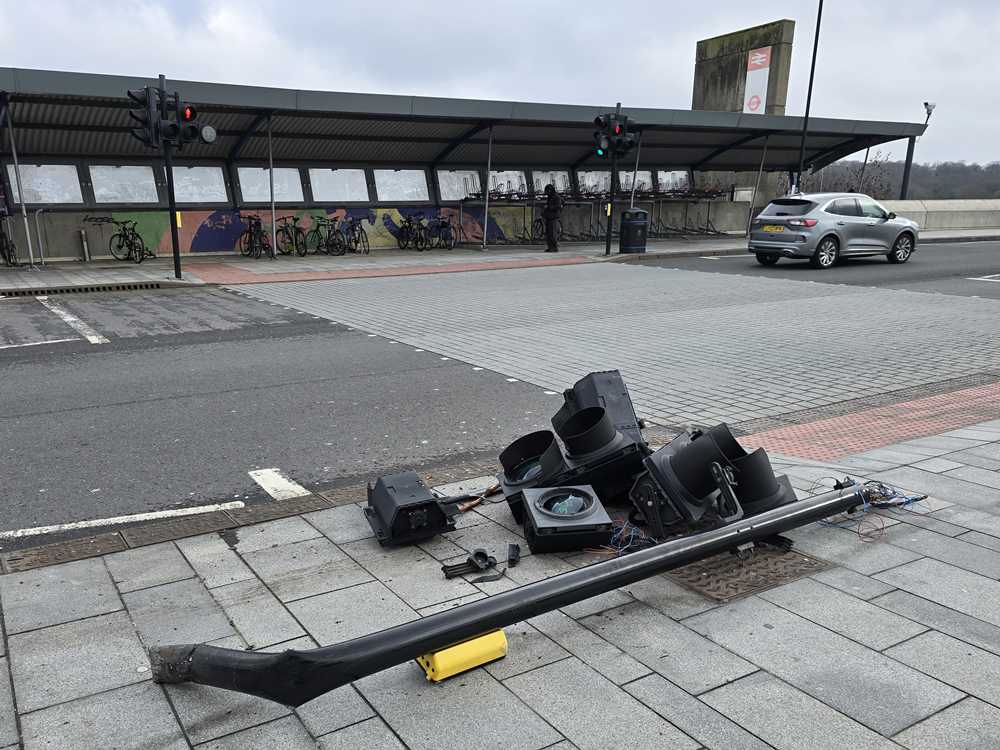pedestrian controlled traffic light was smashed to the ground along with one of
