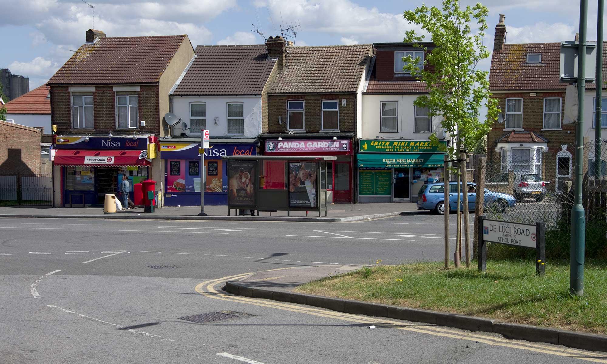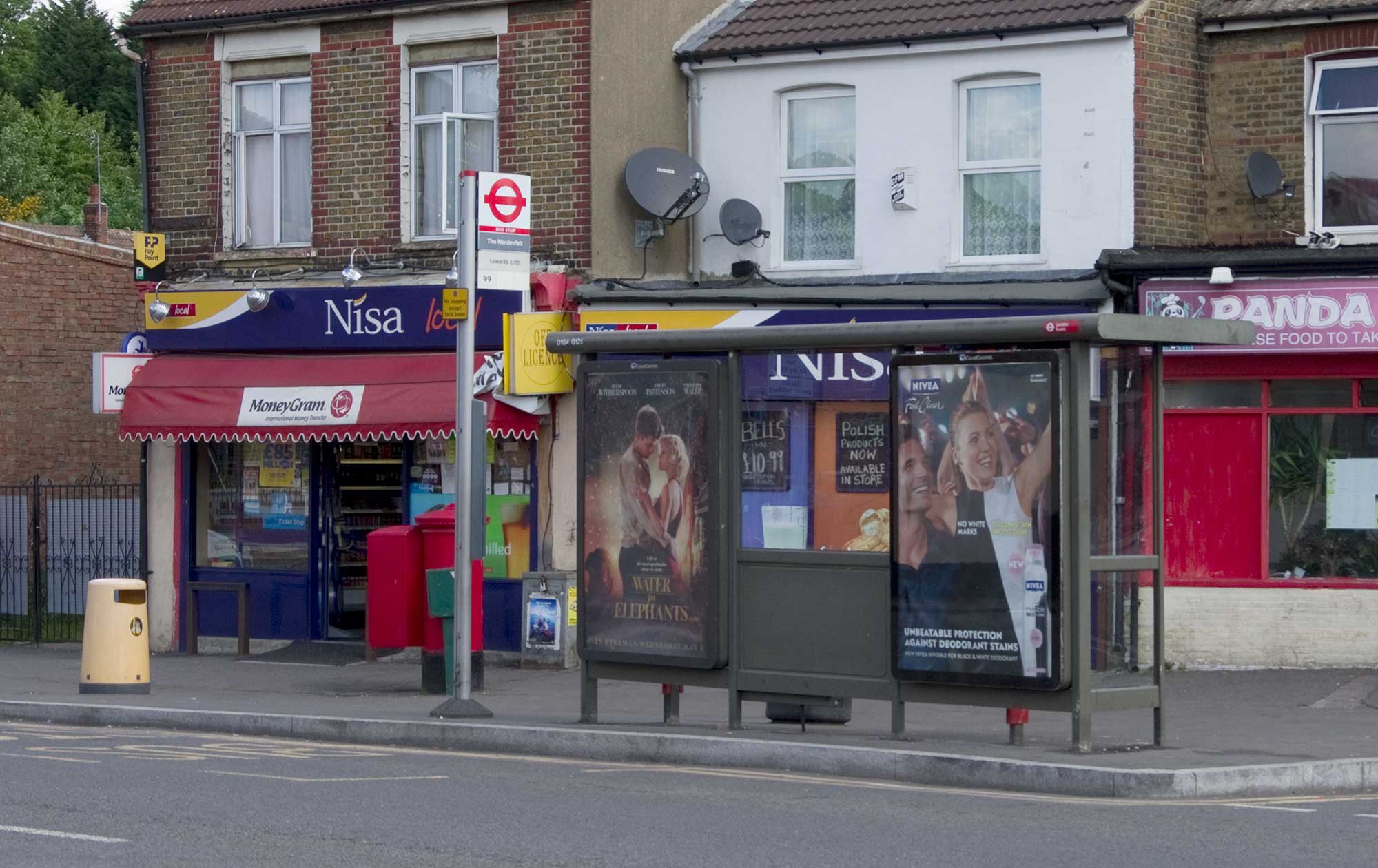 Where Erith Road meets Fraser Road in Erith there are several small shops with a bus stop in front of them